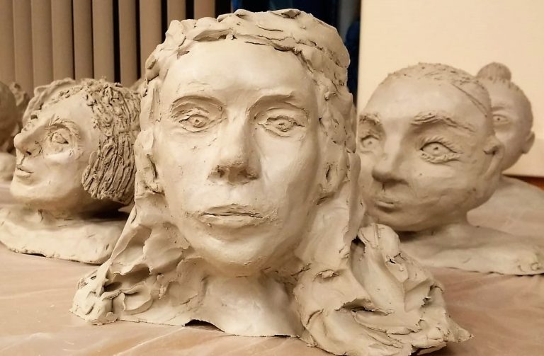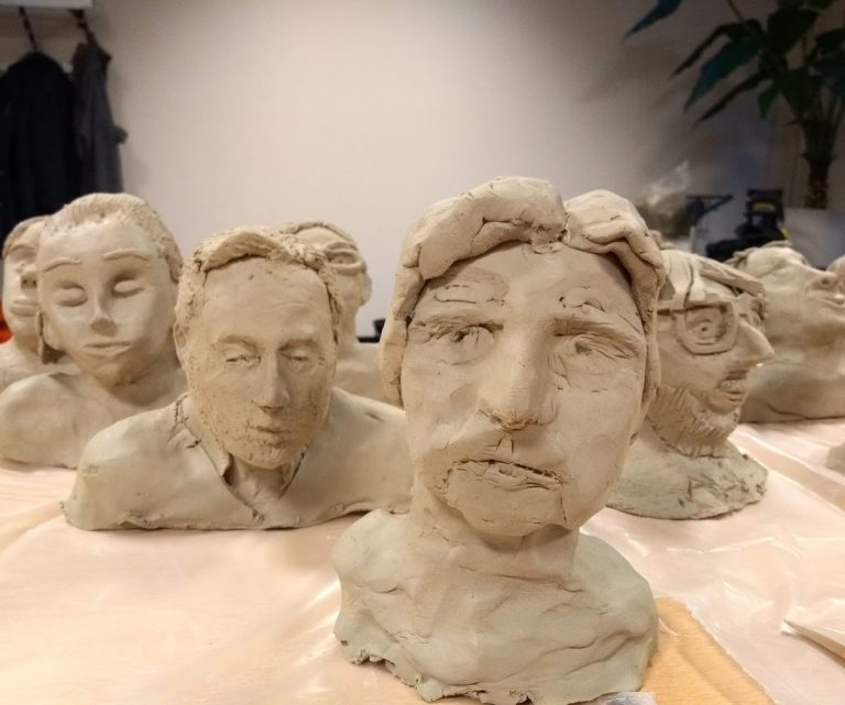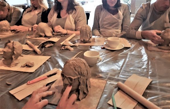 We werken met zachte chamotte klei die niet afgebakken hoeft te worden, maar alleen hoeft te drogen. Natuurlijk neem je je eigen hoofd mee naar huis of kantoor in een doosje en een tasje!